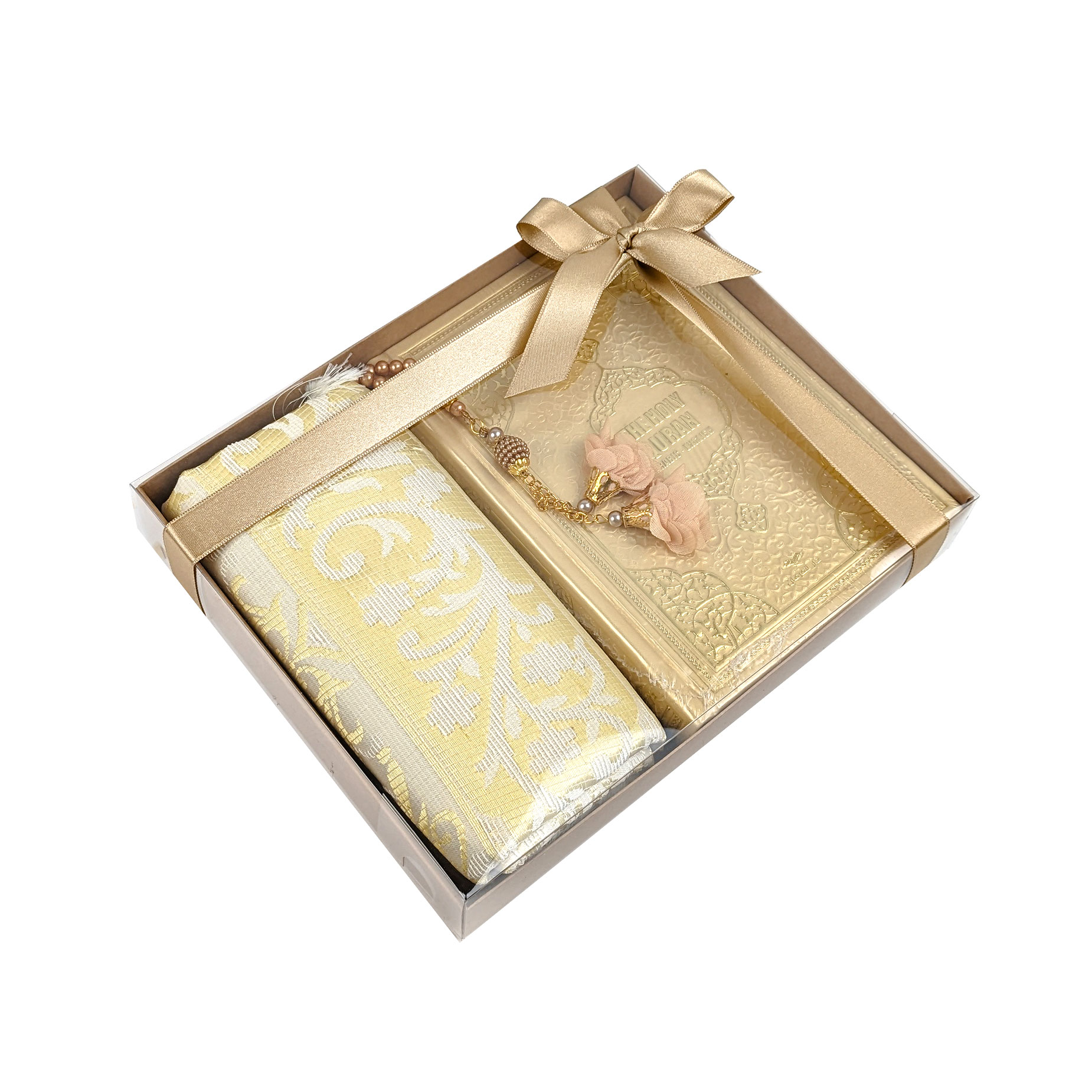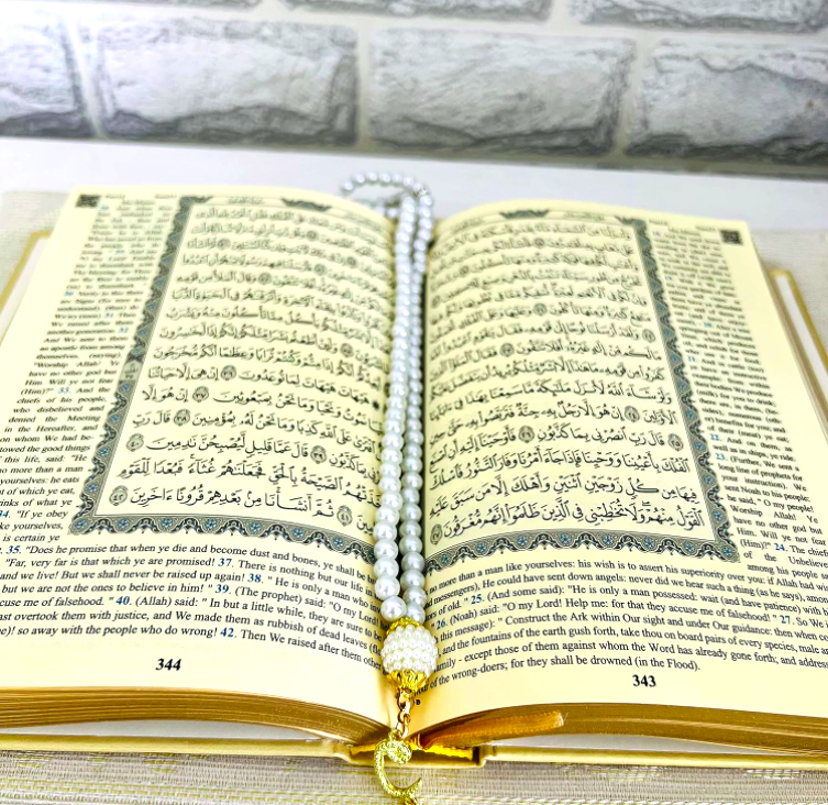 Tasbih (Prayer Beads): Enhance your spiritual practice with the beautifully crafted Tasbih included in this set. These prayer beads, with a pearl effect and adorned with elegant tassels and gold-colored motifs, serve as a tactile guide during your meditative reflection. They are not only a tool for counting prayers but also a symbol of devotion and mindfulness.