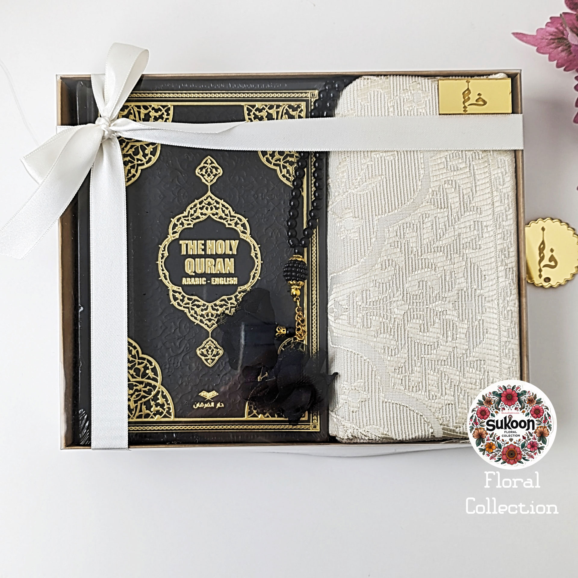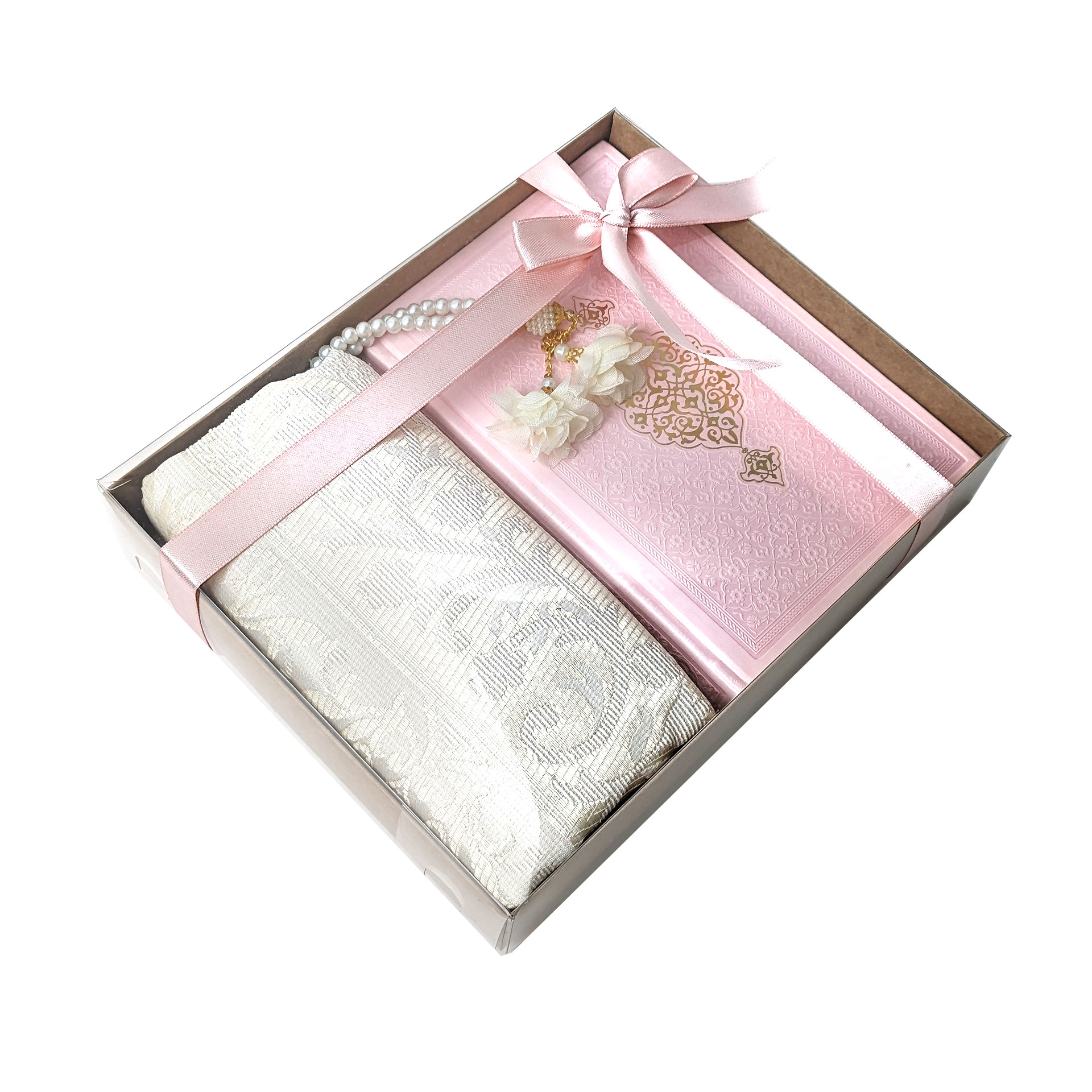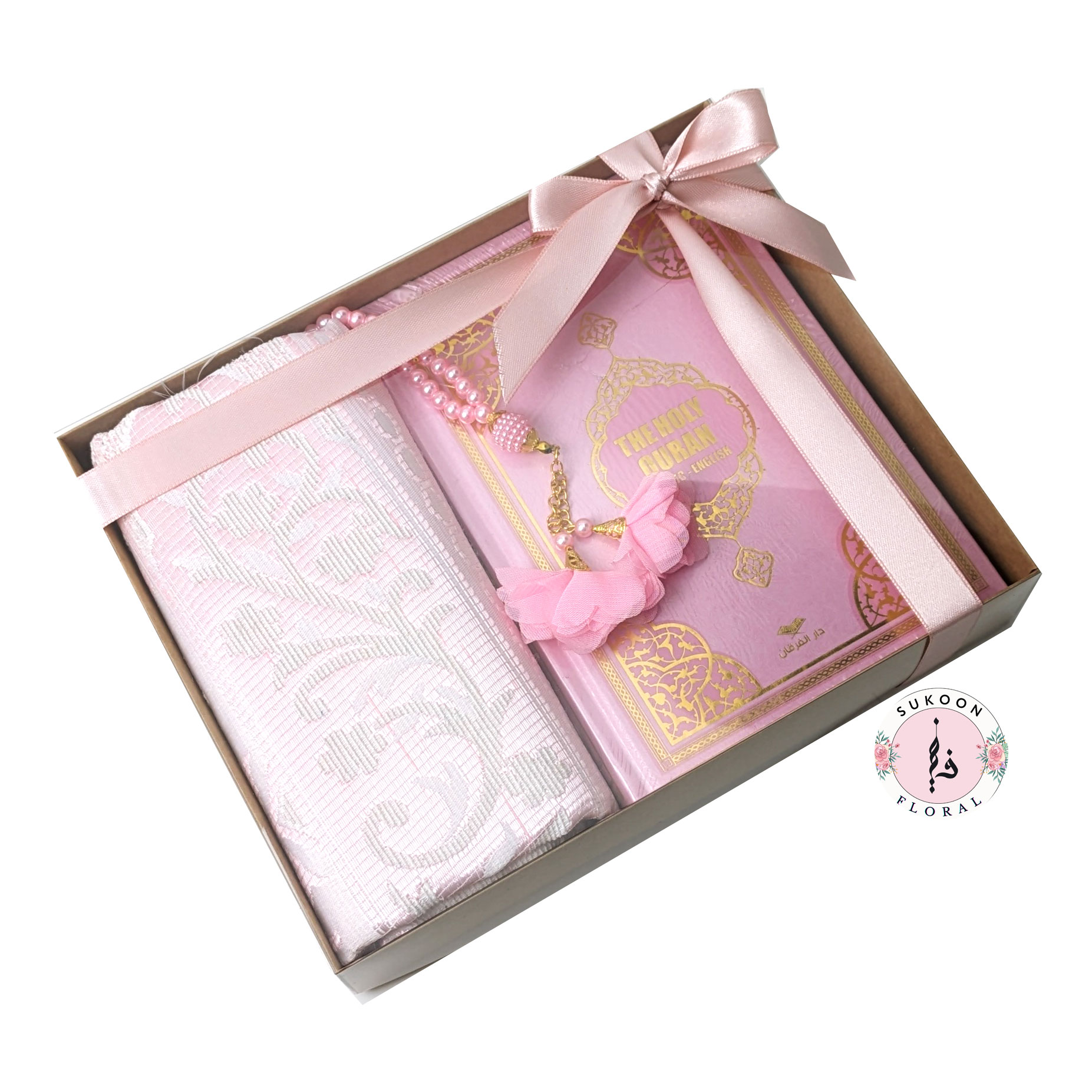 Sukoon Gift Set, a harmonious blend of faith and joy of gifting thoughtfully packed in a beautifully adorned box with a ribbon, available in pastel Pink, Grey, White, and Gold color options.