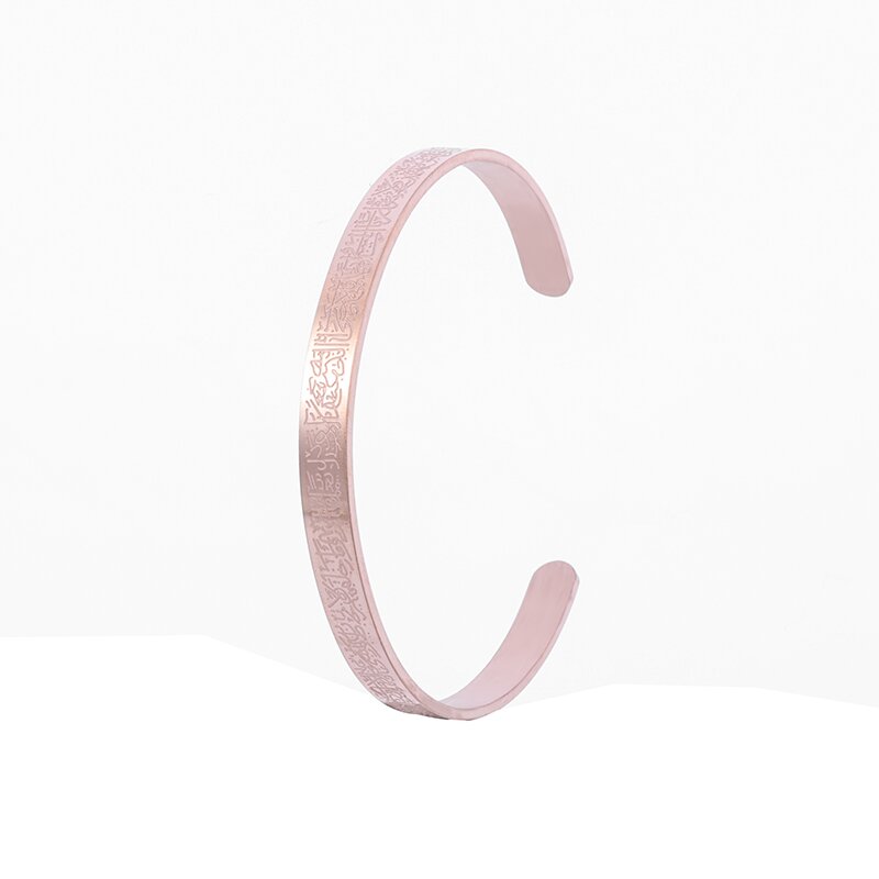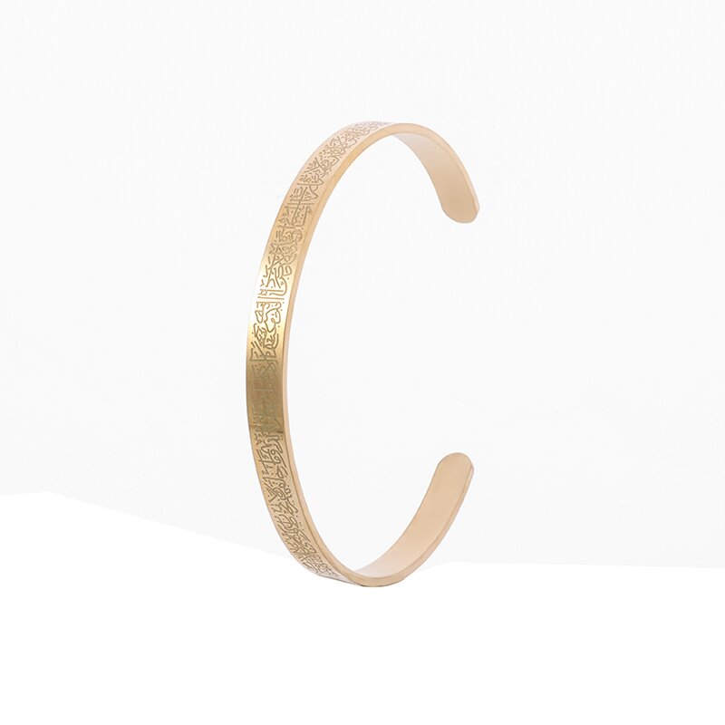The Bracelet features Ayatul Kursi – a sacred verse from the Quran renowned for its profound wisdom and protective qualities. The letters of this inscription are meticulously etched, capturing the fine details that evoke the rich heritage of Islamic calligraphy. The gold color imbues the pendant with a timeless radiance, symbolizing both divinity and opulence.